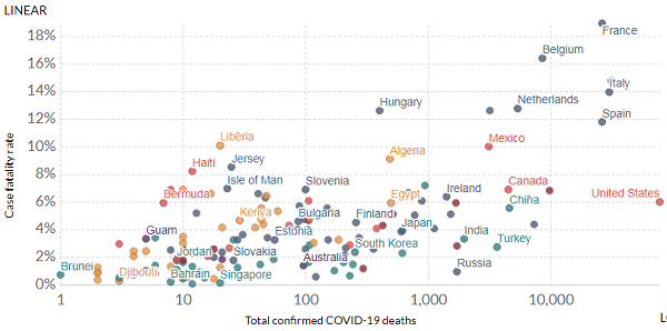The Case Fatality Rate (CFR) for the coronavirus is currently tracking at over 18% for France, over 16% for Belgium, 14% for Italy, nearly 12% for Spain, 10% for Mexico, about 7% for Canada and is currently at 6% for the USA, according to a comprehensive chart offered by OurWorldInData.org.