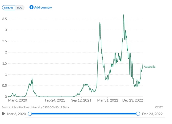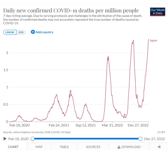 The chart, Horowitz pointed out, shows that Japan’s COVID death curves are progressively worse, and that the change only began after most citizens, and seniors, in particular, were boosted, despite the fact that the Omicron variant is far less pathogenic than previous strains. He also noted that Japan currently leads the world in cases of coronavirus per million people while adding that Australia is experiencing a similar phenomenon.