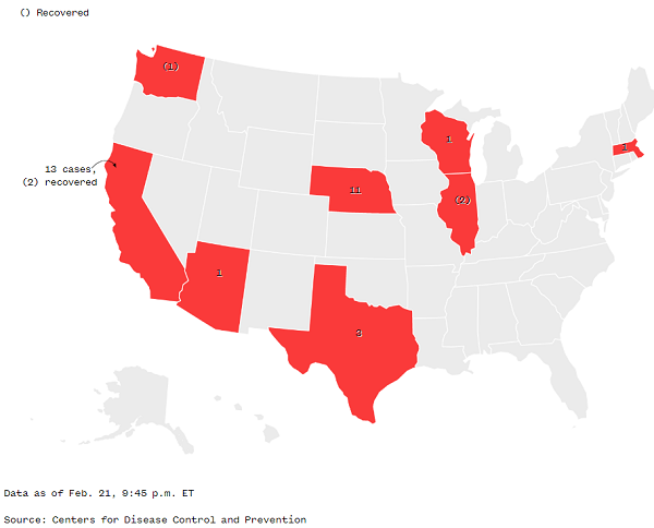 But according to this map of infections in America, via NBC News, there are only 13 cases in California, with 2 recovered there. The map shows 20 cases outside California, including the 11 in Nebraska.