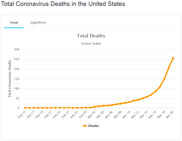 We can barely keep up with the numbers. According to Worldometers.info, there are now 24,000+ confirmed coronavirus infections in the USA, with 288 deaths. Things are moving at breakneck speed, and now the head of the NIH is predicting there will be 70,000 confirmed infections in the USA by the end of next week.