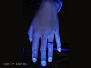 Under the glow of UV lights, the clear Glo Germ gel made the volunteer’s hands whiter if they were dirtier or darker if they were cleaner.