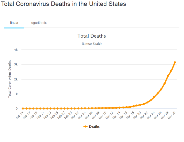 Here’s a look at the sharp increase in coronavirus-related deaths in the USA, via Worldometers.info. This rise hasn’t yet reached an inflection point that might indicate a slowing: