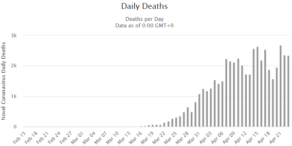 Daily deaths from the coronavirus in the United States continue to track at over 2,000 per day for most days spanning the last two weeks: (source: Worldometers.info)