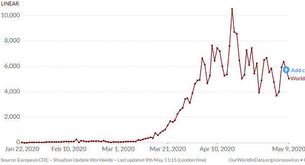 As you can see from this global chart of confirmed covid-19 deaths, we haven’t stopped the pandemic, we’ve only paused it. The exponential explosion has simply been “flattened” but not crushed. Deaths are moving sideways during the lockdown, which means once the lockdowns are ended alongside widespread complacency, the coronavirus will simply resume its exponential growth once again. This chart shows daily deaths: