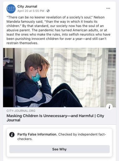 Facebook promptly slapped a label on the article: “Partly False Information. Checked by independent fact-checkers.” City Journal appealed the ruling, a process that turned out to be both futile and revealing. Facebook refused to remove the label, which still appears whenever the article is shared, but at least we got an inside look at the tactics that social-media companies and progressive groups use to distort science and public policy.