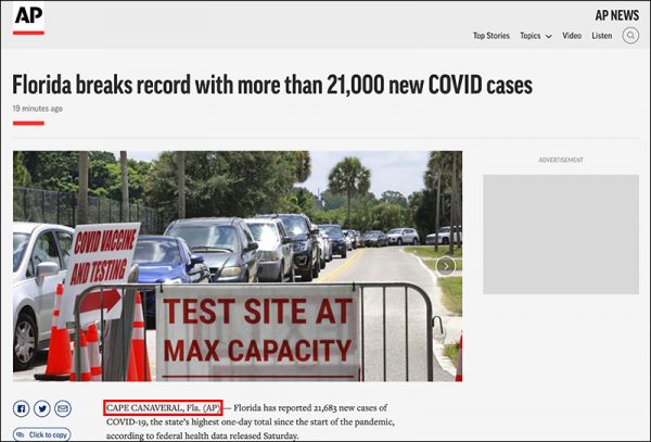 The journalist was referring to an AP report out of Cape Canaveral which claimed Florida was seeing peak hospitalizations. (The location of the report later changed to “Orlando“).