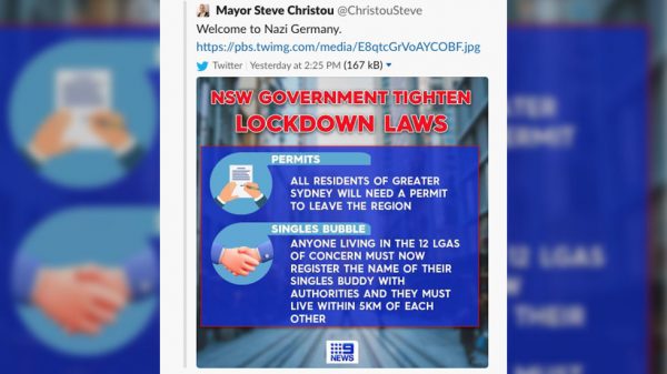 Mayor Steve Christou, of Cumberland City Council, tweeted an official graphic illustrating new lockdown rules on Friday. Having posted the image that warned residents of the mandate that requires them to have a permit to leave the region and to register their personal details to be allowed to visit a “singles buddy” within a five-kilometer (three-mile) reach, he wrote: “Welcome to Nazi Germany.” The comment from the councilor, who describes himself as having “a tendency to speak what I think,” was later deleted.