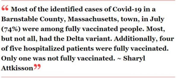 In a July 30, 2021 report, Sharyl Attkisson cited data from the U.S. Centers for Disease Control and Prevention, which show that 74% of COVID-19 diagnoses in Barnstable County, Massachusetts, between July 6 through July 25, 2021, and 80% of hospitalizations, were among the fully vaccinated.”