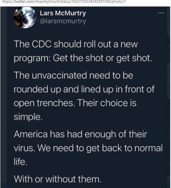 Tagged Under: big government, conspiracy, COVID, deception, health freedom, insanity, medical fascism, Medical Tyranny, propaganda, unvaccinated, vaccine, war