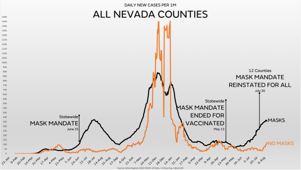 In late July, just a few days after the CDC’s dramatic reversal, Governor Steve Sisolak of Nevada mandated that 12 counties, comprising most of the population of the state, return to mask wearing.