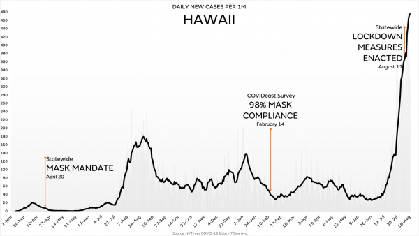Hawaii never removed their mask mandate, the only state to keep a mask requirement for everyone, regardless of their vaccination status. They’ve had overwhelming compliance throughout the pandemic, and are rapidly approaching a year and a half of consistent mask wearing rules.
