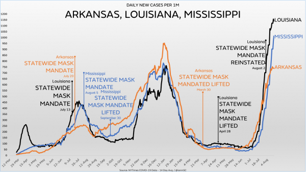 One such state is Louisiana, where Governor John Bell Edwards, a True Believer, mandated masks again out of desperation at his state’s rising case rate. Nearby, Arkansas and Mississippi did not mandate masks, despite Arkansas Governor Asa Hutchinson’s best efforts.