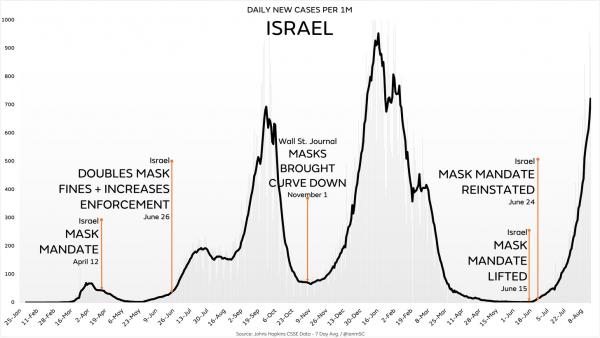 The mask failure isn’t just limited to the United States either. Other countries and areas are experiencing the same thing. Most importantly, Israel, where masks, previously credited with lowering the curve, were brought back after only nine days: