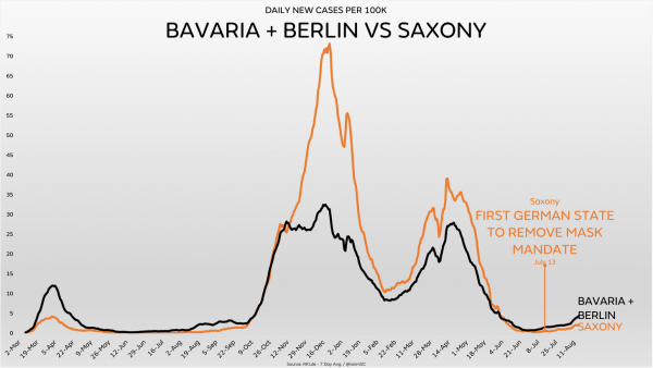 More importantly though, Saxony became the first German state to remove their mask mandate on July 13th. This creates a compelling comparison point to Bavaria and Berlin, with regards to their N95 mandates. So what’s happened?
