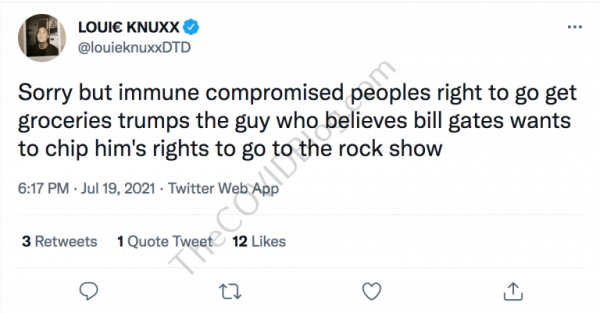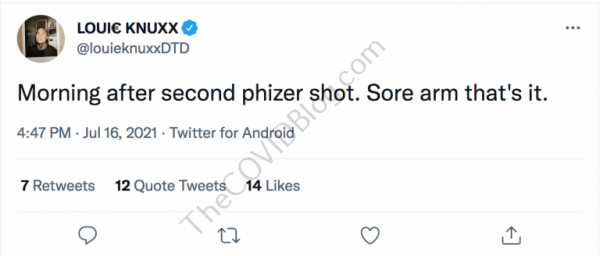 Mr. Todd Williams, aka Louie Knuxx, received his second dose of experimental Pfizer mRNA on July 15, according to his Twitter page. He reported sore arms the following morning, but no other adverse effects. He also said he was “ready to party.”