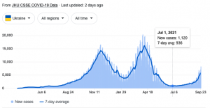 Ukraine had a 1.7% “fully vaccinated” rate on July 1. The country had a seven-day average of 936 new COVID-19 case on that day. That’s the lowest seven-day average in the country since late July 2020. Ukraine is 12% fully-vaccinated today, with a seven-day average of 5,921 new COVID cases. That’s a 532% increase since July.