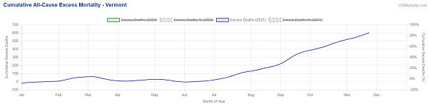 What’s especially instructive is looking at Vermont, the state with the highest vaccination compliance in America. Here’s a chart showing excess deaths for 2021. Note the sharp uptick as the winter months are kicking in: