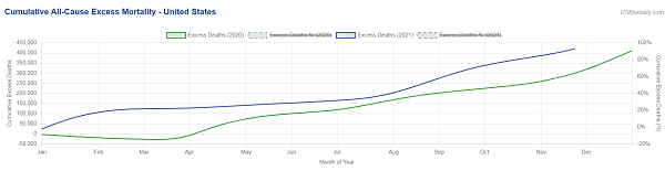 A website called USmortality.com shows charts of excess deaths. That site reveals that both 2020 and 2021 had experienced significant excess deaths.