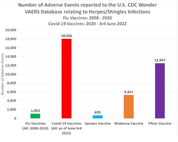 Per the CDC Wonder Vaccine Adverse Event Reporting System (VAERS) database, as of June 3, 2022, the federal health agency has seen 18,026 reports that relate to shingles and herpes infections that have occurred as a result of reactions to multiple COVID-19 vaccines: