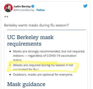 campus insanity, covid mask, Flu, flu mask, Flu vaccine, forced vaccination, health freedom, mask mandate, mask requirement, Medical Tyranny, political correctness, propaganda, seasonal flu, toxic ingredients, toxic vaccines, UC Berkeley