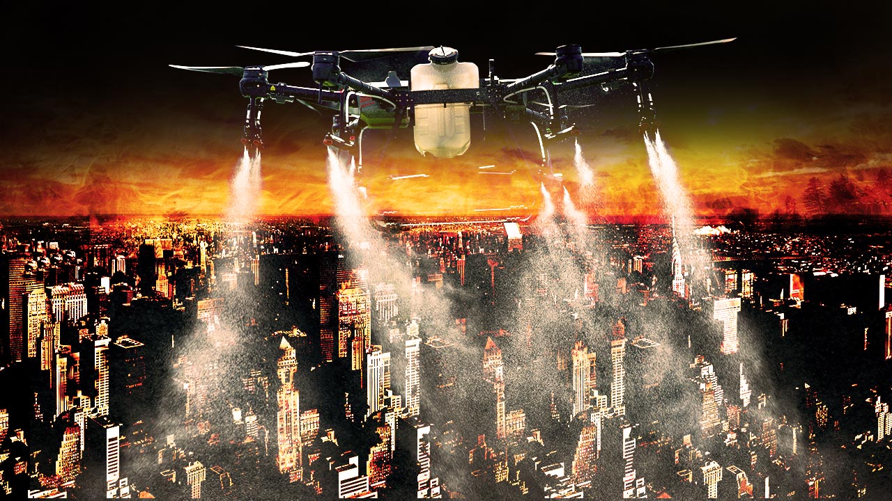 What’s fascinating here is that this aerial drone bioweapons release system means it is possible to fake a pandemic by air dropping chemical toxins onto a population, without any virus existing at all. Once the population uptakes the toxins, they are driven by media fear to beg for vaccines. These “vaccines” then inject them with mRNA instructions that can program their cells to synthesize venom peptide proteins in their own bodies, creating even more symptoms and causing “shedding” / spreading of the venom peptides to others around them. This is then called an “epidemic” of viral spread, when there’s no virus even necessary for this process to be created.