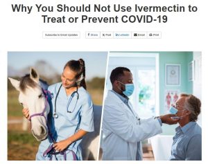Just in case the anti-conspiracy theory conspiracy theorists are having any doubts, the title the FDA used about ivermectin that they are now forced to remove goes like this, “Why You Should Not Use Ivermectin to Treat or Prevent COVID-19.” But that’s not all. The article is featured with a picture of a doctor and a horse, so every American would agree and also fear taking a medicine the FDA was propagating as only proper for horses, and would be very dangerous for humans to take. That is illegal propaganda, and it cost the lives of tens of millions of people, if not more.